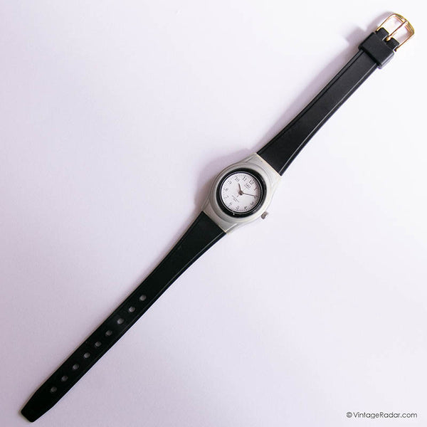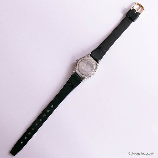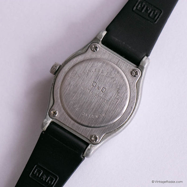 This is a sporty vintage Q&Q watch for women that comes with a retro design, featuring a silver-tone plastic case and a comfortable black strap. The watch will best fit small and medium wrist sizes (ladies).