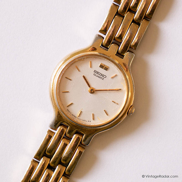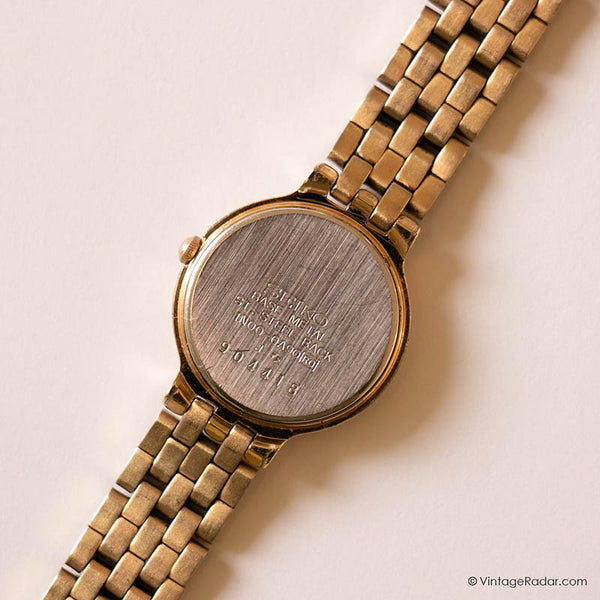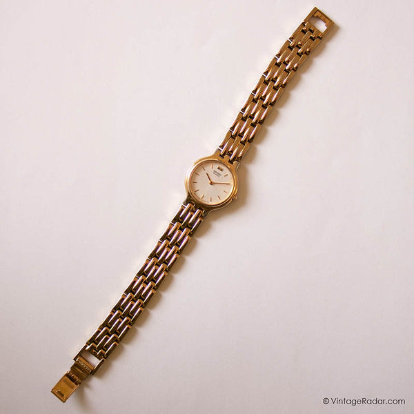 This is a vintage Seiko 1N00-0A90 R0 watch for ladies that comes with a versatile design, ideal for everyday wear. The 22-mm gold-tone case is paired with a slim gold-tone bracelet, and the white dial with a textured finish beautifully completes the design.