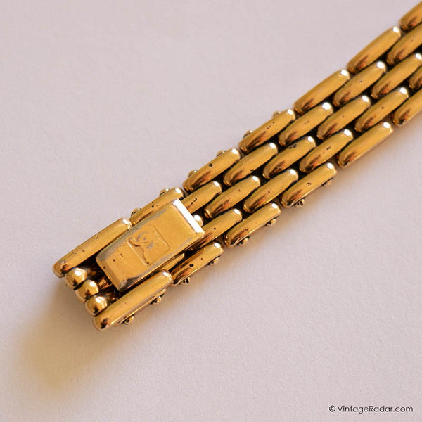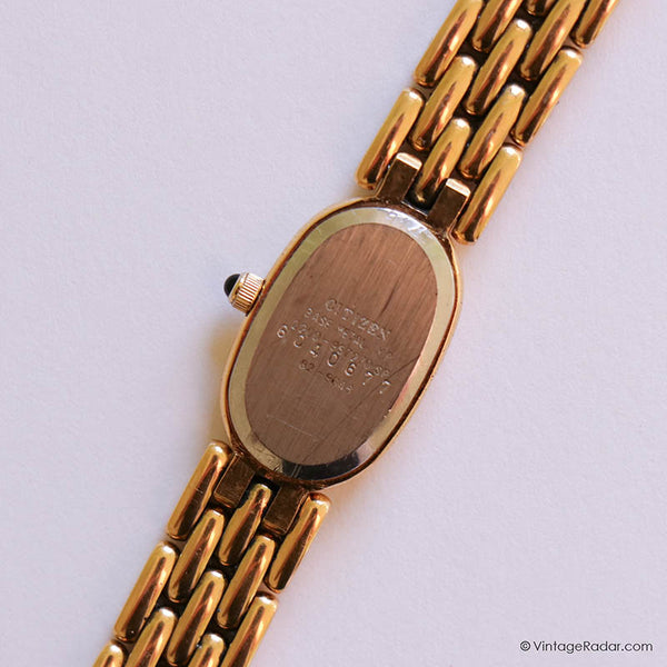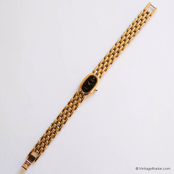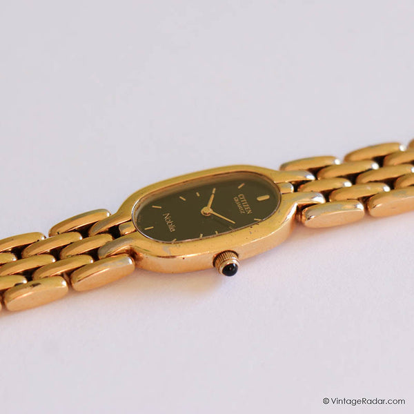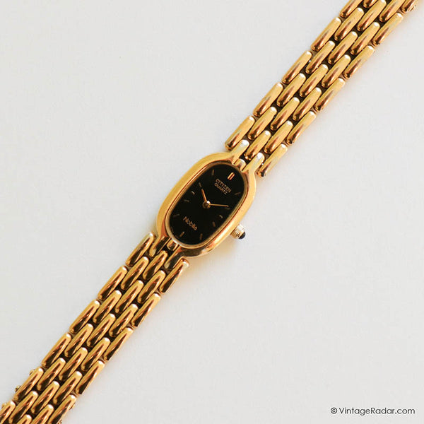 Dies seltener Jahrgang Citizen Noblia Damen Uhr sieht am Handgelenk so zart aus. Es ist eine zierliche Armbanduhr mit einem winziges ovales Gehäuse, und a schwarzes Zifferblatt Dadurch entsteht ein schöner Kontrast zum goldfarbenen Gehäuse und Armband. Eine ideale Passform für kleine Handgelenke Jahrgang Citizen Uhr wird von einem präzisen angetrieben Japanisches Quarzwerk.