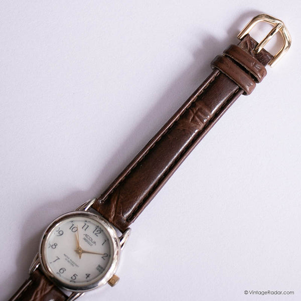 Classic, minimalist, perfect for everyday wear, this vintage Acqua Indiglo ladies' watch comes in amazing condition. The 23-mm case surrounds a simple white dial with Arabic numerals, and the design is complete with the beautiful brown leather strap.