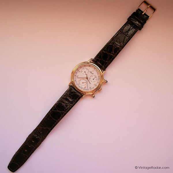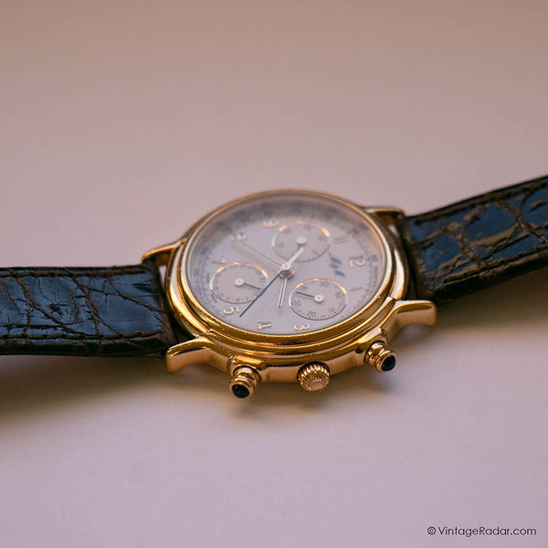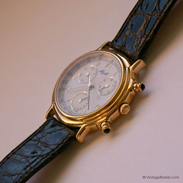 Este es un hermoso conservado art deco vintage reloj por M&M, en cálidos tonos dorados. es un hecho en Suiza chronograph reloj con un diseño especialmente elegante, ideal para días de oficina y vestimenta formal.