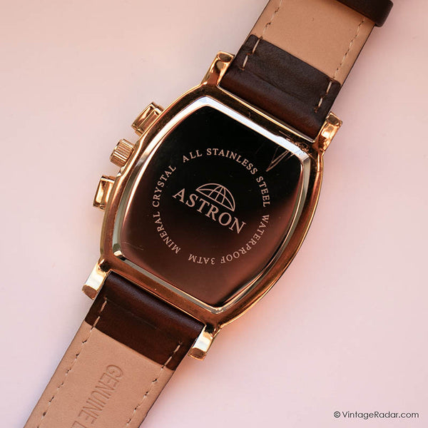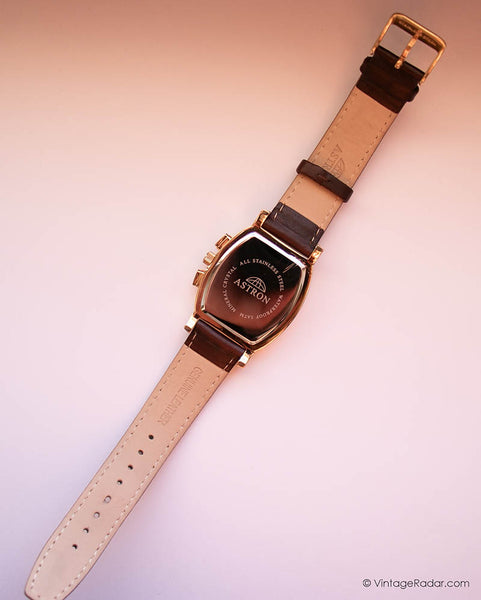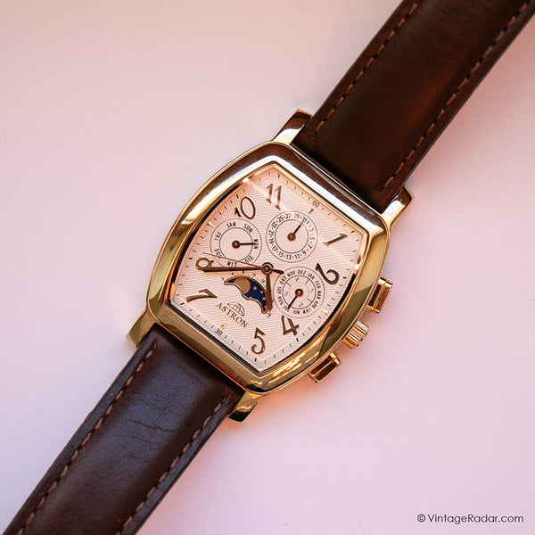 con un elegante caja en forma de Tonneau en tonos dorados, esto Fase lunar de Astron vintage reloj para caballeros luce atemporal en la muñeca. La caja en tono dorado y la subesfera de fase lunar ofrecen un hermoso toque vintage al diseño del reloj.