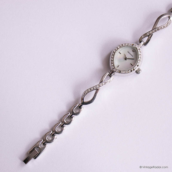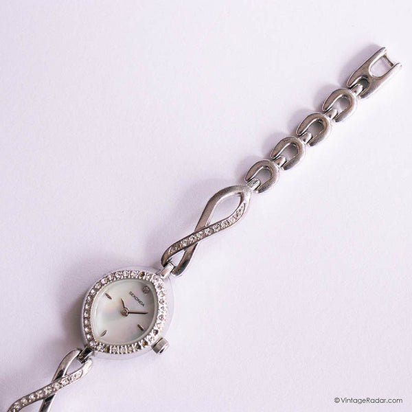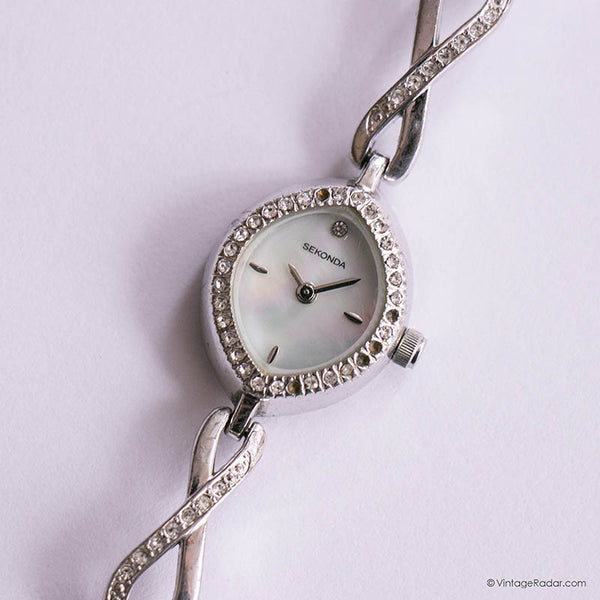 This tiny vintage Sekonda ladies' watch comes with a beautiful diamond-shaped case, and a pearly white dial. The case and bracelet are embelished with beautiful, white gemstones. A delicate timepiece, this vintage Sekonda watch can make the perfect dress watch for special occasions.