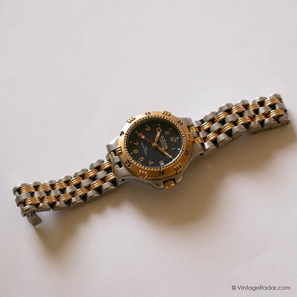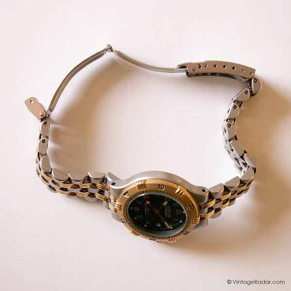 Dans des tons d'argent et d'or, ce vintage Adidas Aventure montre pour les dames est la montre rétro parfaite pour les poignets de petite taille. Il est livré avec une belle cadran bleu marine, mains qui brillent dans le noir, et un utile guichet de date à 3 heures.
