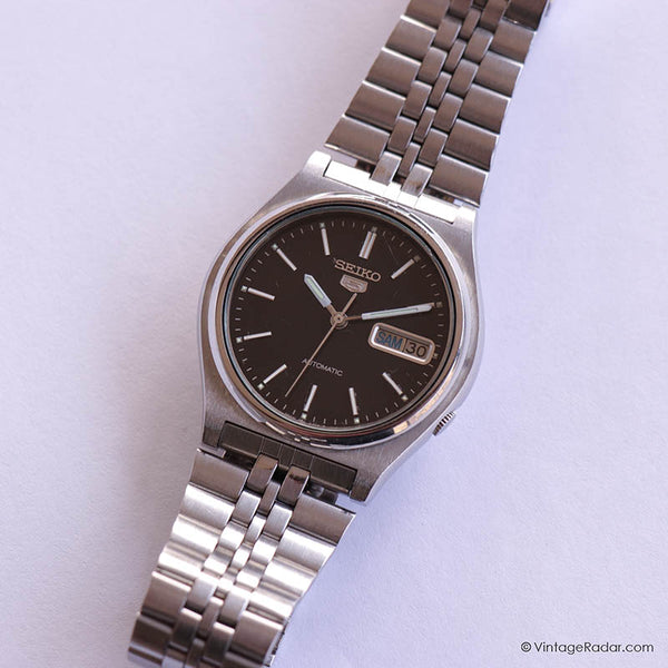The perfect everyday watch, this vintage Seiko 5 automatic 7009-3170 A2 watch comes with a minimalist design and precise movement. The watch is sleek, modern, pairing a stainless steel bracelet with a 36-mm silver-tone case and a minimalist black dial. A useful day-date window is featured at 3 o'clock.