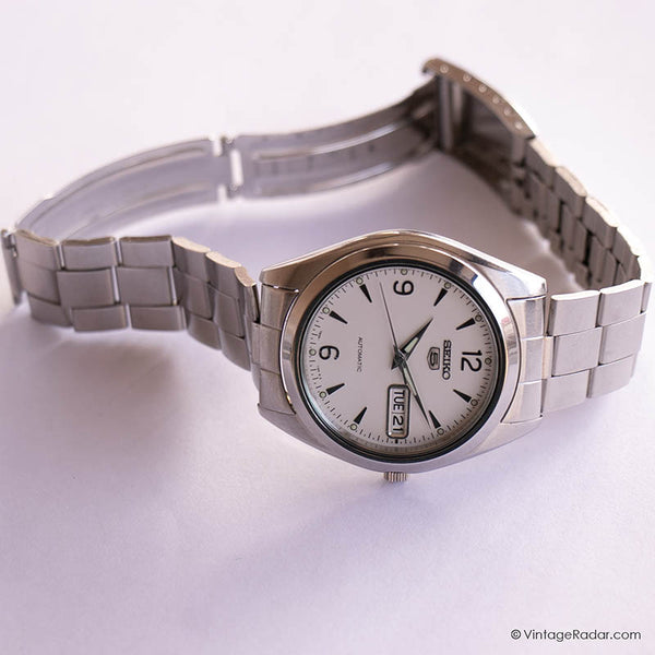 Let us introduce you to a beautifully-preserved Seiko 5 automatic 7009-3170 A2 watch model, featuring a modern, minimalist design. With a silver-tone case and bracelet, the watch stands out thanks to its lovely white dial, featuring a day-date window at 3 o'clock. The pointy glow-in-the-dark hands add a touch of sophistication to the design of the piece.