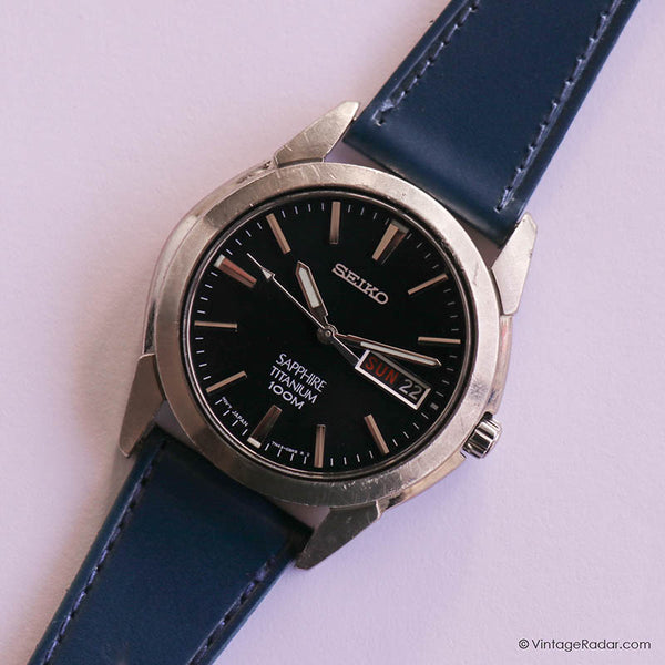 Let us introduce you to a rare vintage Seiko Sapphire Titanium watch for men, which comes with a stunning dark blue dial that changes color under light. The timepiece comes in very good condition, with small signs of age on the case. We've placed it on a high-quality leather strap that's comfortable to have on the wrist.