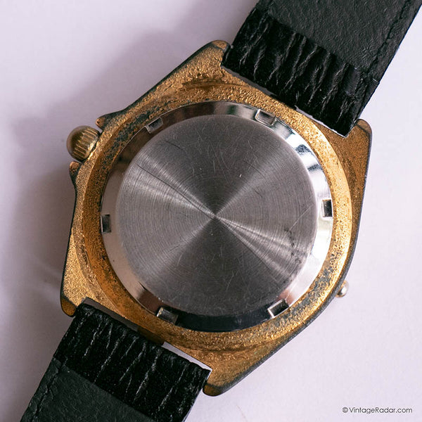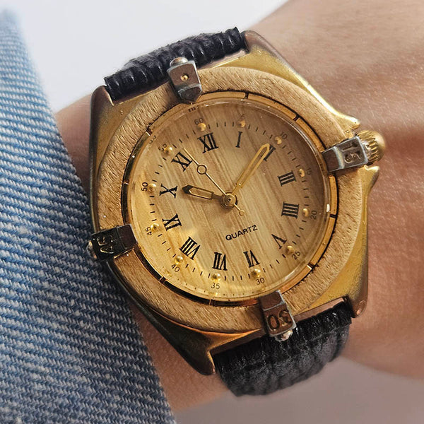This is a vintage gold-tone watch for women that features a rustic, wooden bezel, and a textured black leather strap. The color of the case is a bit aged, as you can see in the photos, giving the watch a vintage finishing touch.